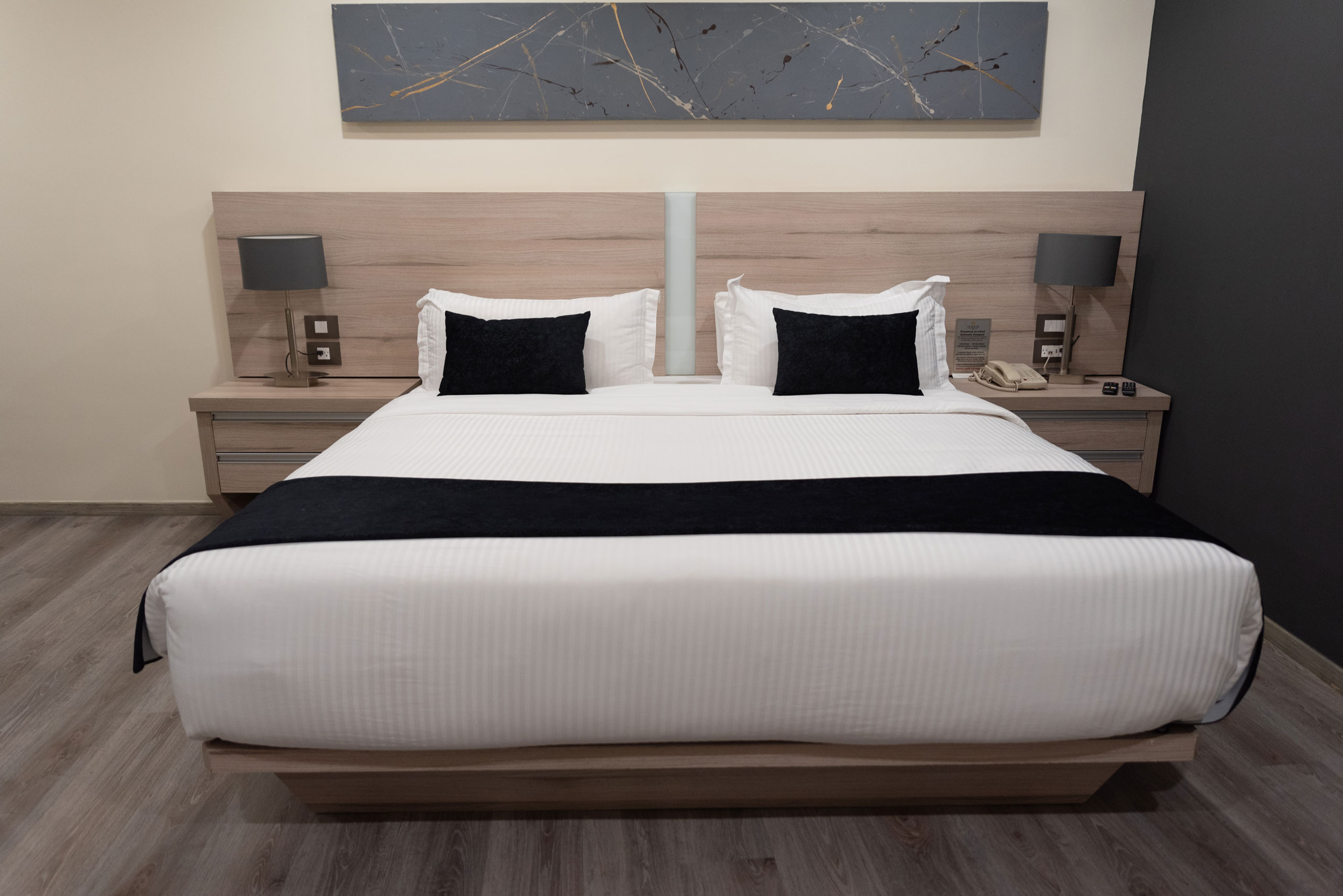 Confortable habitación con cama King Size y una pequeña sala con vista al estadio de futbol, prueba la cocineta que es ideal para ejecutivos o viajeros de larga estancia.